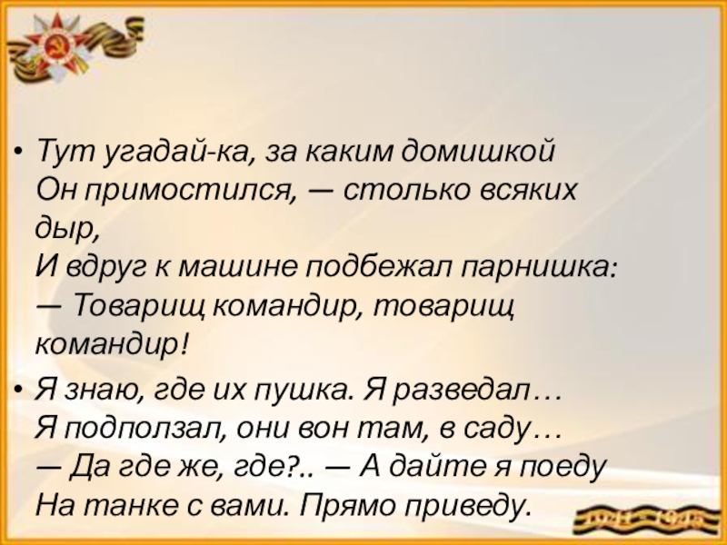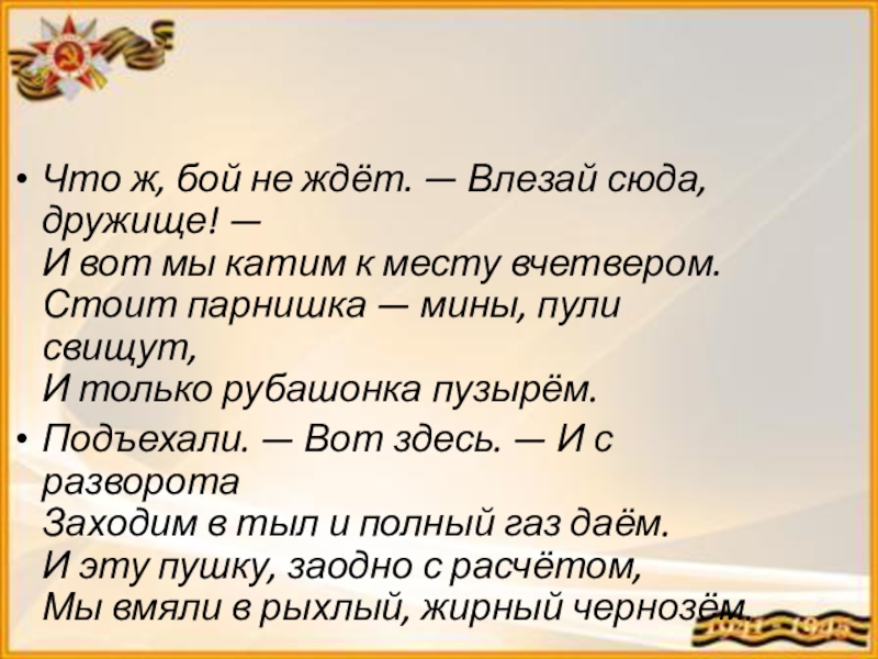 Слайд 13Что ж, бой не ждёт. — Влезай сюда, дружище! —