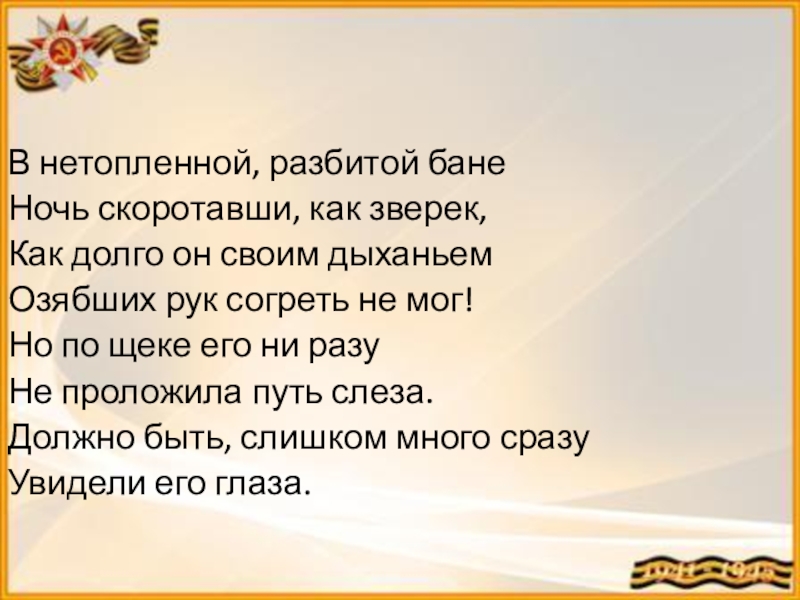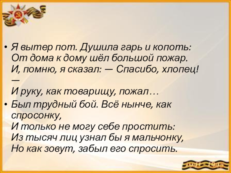 Слайд 14Я вытер пот. Душила гарь и копоть: