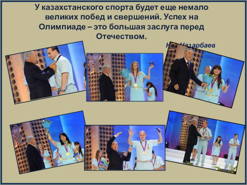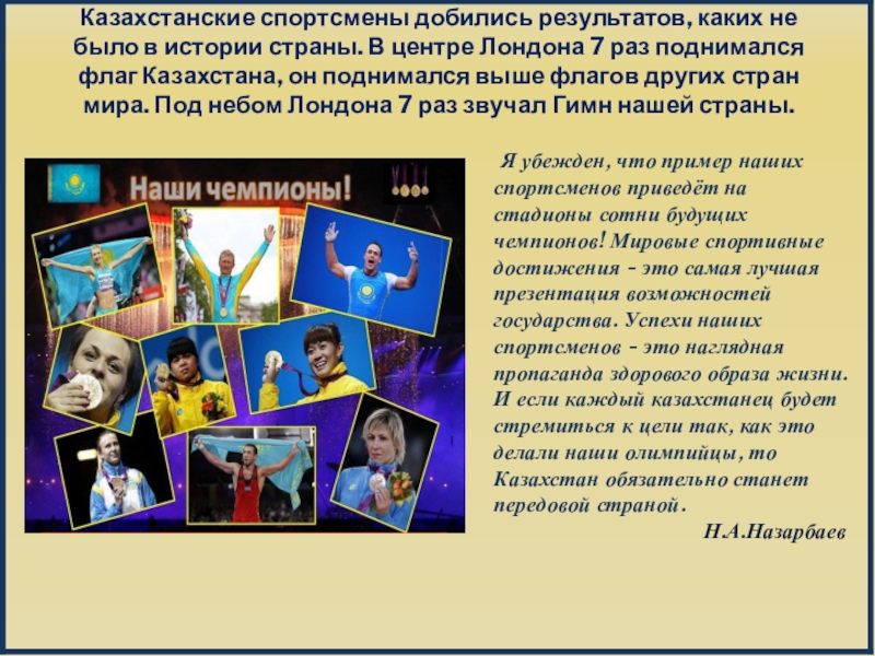 Я убежден, что пример наших спортсменов приведёт на стадионы сотни будущих чемпионов! Мировые спортивные достижения - это самая лучшая презентация возможностей государства. Успехи наших спортсменов - это наглядная пропаганда здорового образа жизни. И если каждый казахстанец будет стремиться к цели так, как это делали наши олимпийцы, то Казахстан обязательно станет передовой страной.