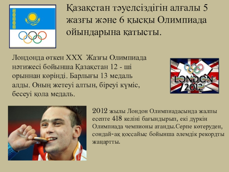 Лондонда өткен ХХХ Жазғы Олимпиада нәтижесі бойынша Қазақстан 12 - ші орыннан көрінді. Барлығы 13 медаль алды. Оның жетеуі алтын, біреуі күміс, бесеуі қола медаль.