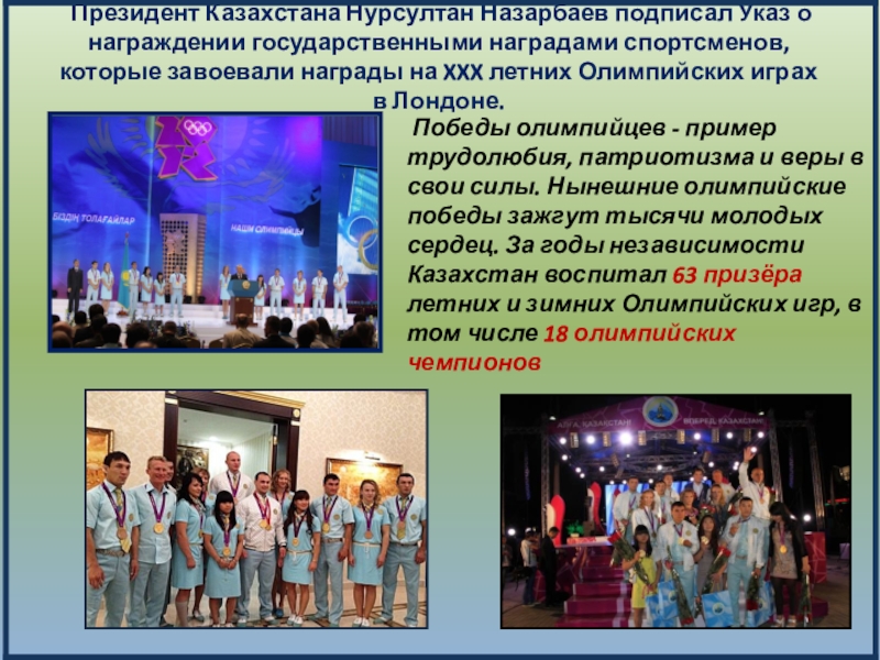 Победы олимпийцев - пример трудолюбия, патриотизма и веры в свои силы. Нынешние олимпийские победы зажгут тысячи молодых сердец. За годы независимости Казахстан воспитал 63 призёра летних и зимних Олимпийских игр, в том числе 18 олимпийских чемпионов