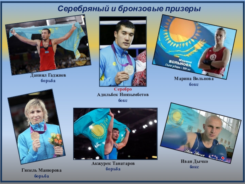 вручен боксерам Адильбеку Ниязымбетову, Марине Вольновой, Ивану Дычко, борцам Даниялу Гаджиеву, Гюзель Манюровой и Акжуреку Танатарову.