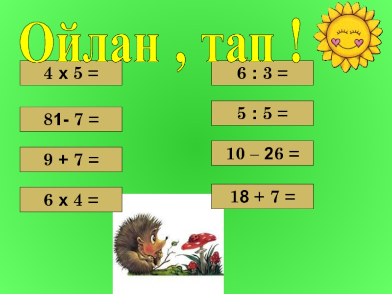4 х 5 =9 + 7 =81- 7 =6 х 4 =10 – 26 =5 : 5 =6 : 3 =18 + 7 =Ойлан , тап !