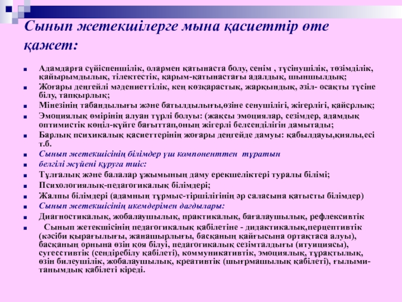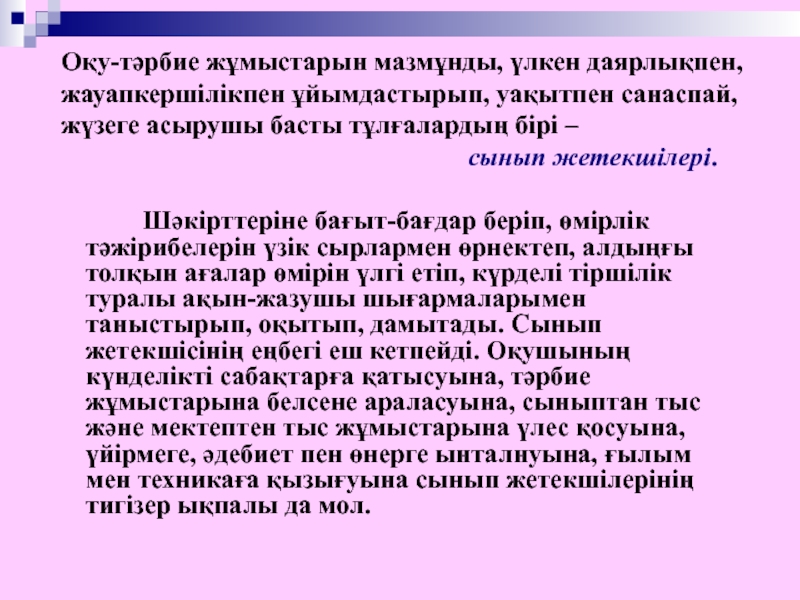 Шәкірттеріне бағыт-бағдар беріп, өмірлік тәжірибелерін үзік сырлармен өрнектеп, алдыңғы толқын ағалар өмірін үлгі етіп, күрделі тіршілік туралы ақын-жазушы шығармаларымен таныстырып, оқытып, дамытады. Сынып жетекшісінің еңбегі еш кетпейді. Оқушының күнделікті сабақтарға қатысуына, тәрбие жұмыстарына белсене араласуына, сыныптан тыс және мектептен тыс жұмыстарына үлес қосуына, үйірмеге, әдебиет пен өнерге ынталнуына, ғылым мен техникаға қызығуына сынып жетекшілерінің тигізер ықпалы да мол.