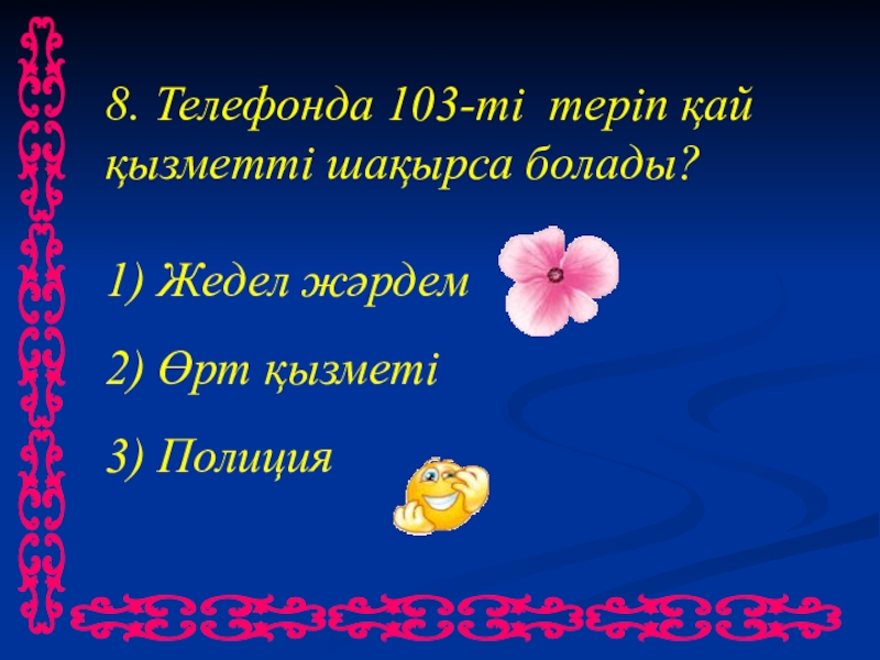 Слайд 118. Телефонда 103-ті теріп қай қызметті шақырса болады?