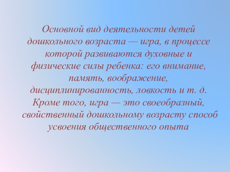 развиваются духовные и физические силы ребенка: его внимание, память, воображение, дисциплинированность, ловкость и т. д. Кроме того, игра — это своеобразный, свойственный дошкольному возрасту способ усвоения общественного опыта