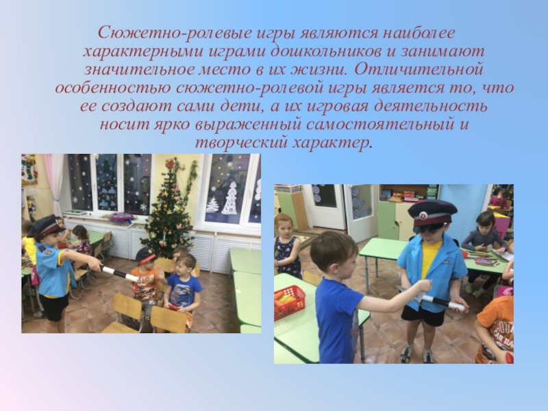 Сюжетно-ролевые игры являются наиболее характерными играми дошкольников и занимают значительное место в их жизни. Отличительной особенностью сюжетно-ролевой