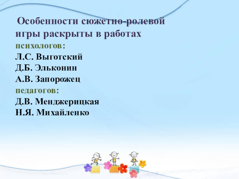 Слайд 15 Особенности сюжетно-ролевой игры раскрыты в работах психологов: