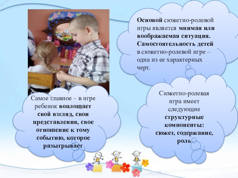 ребенка, развивая произвольное внимание, память, воображение, творчество. Через сюжетно-ролевую игру педагог выводит ребенка во взрослую жизнь, учит думать, чувствовать, действовать, адаптироваться к меняющимся условиям, принимать решения в незнакомой обстановке.
