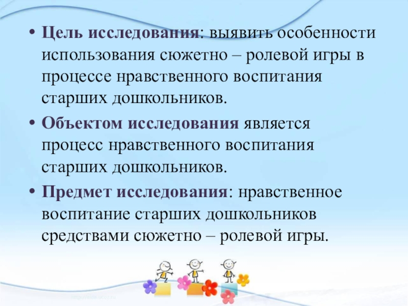 Объектом исследования является процесс нравственного воспитания старших дошкольников.