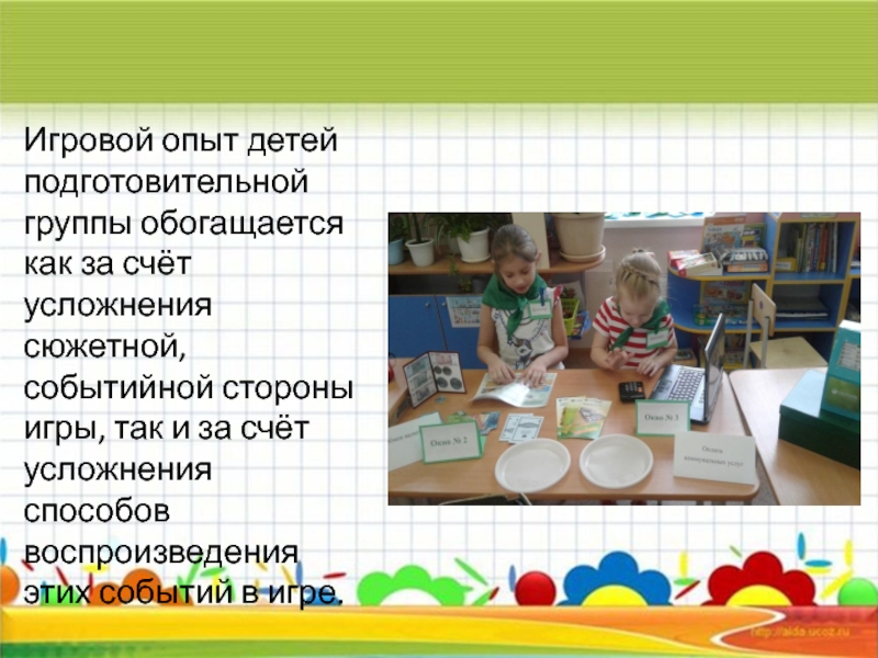Слайд 4Игровой опыт детей подготовительной группы обогащается как за счёт усложнения сюжетной,