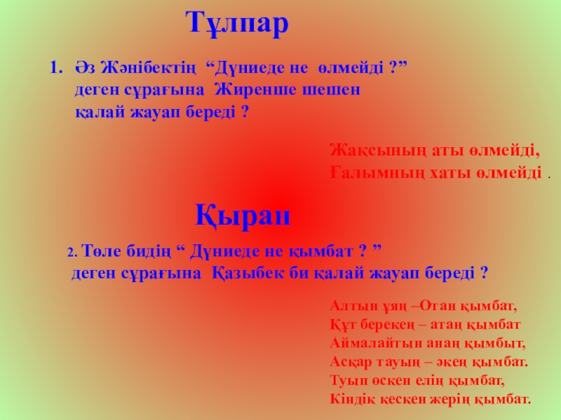 2. Төле бидің “ Дүниеде не қымбат ? ”