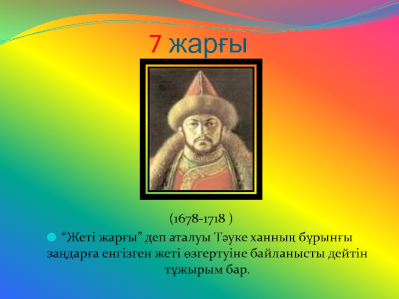 “Жеті жарғы” деп аталуы Тәуке ханның бұрынғы заңдарға енгізген