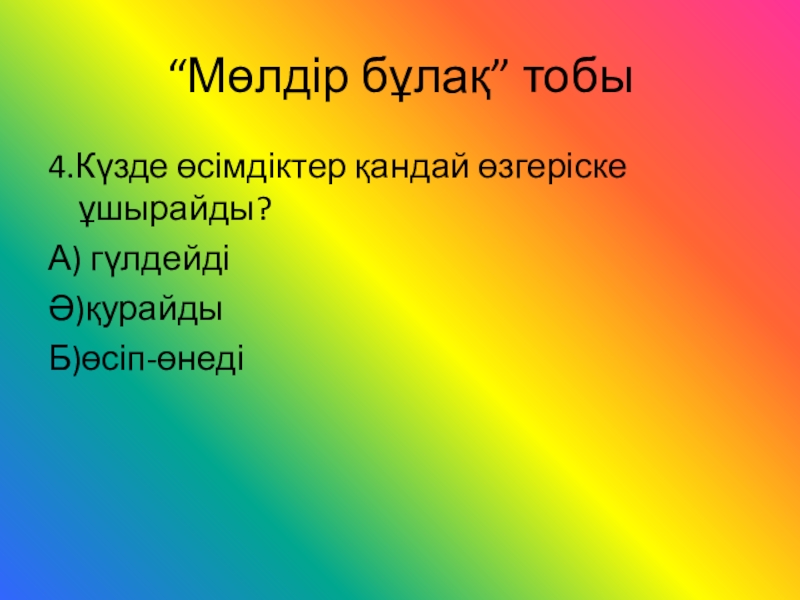 “Мөлдір бұлақ” тобы4.Күзде өсімдіктер қандай өзгеріске ұшырайды?А) гүлдейдіӘ)қурайдыБ)өсіп-өнеді