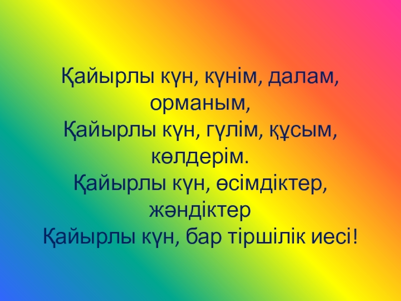 Слайд 2Қайырлы күн, күнім, далам, орманым, Қайырлы күн, гүлім, құсым, көлдерім. Қайырлы