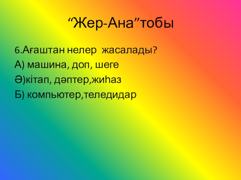 “Жер-Ана”тобы6.Ағаштан нелер жасалады?А) машина, доп, шегеӘ)кітап, дәптер,жиһазБ) компьютер,теледидар