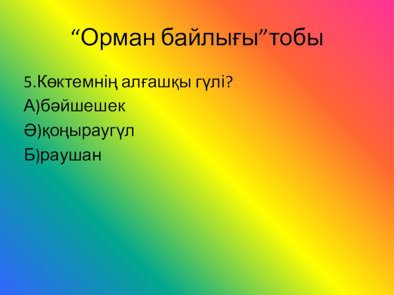 “Орман байлығы”тобы5.Көктемнің алғашқы гүлі?А)бәйшешекӘ)қоңыраугүлБ)раушан