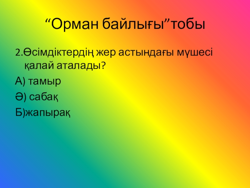 “Орман байлығы”тобы2.Өсімдіктердің жер астындағы мүшесі қалай аталады?А) тамырӘ) сабақБ)жапырақ