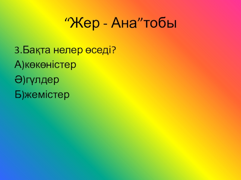 “Жер - Ана”тобы3.Бақта нелер өседі?А)көкөністерӘ)гүлдерБ)жемістер