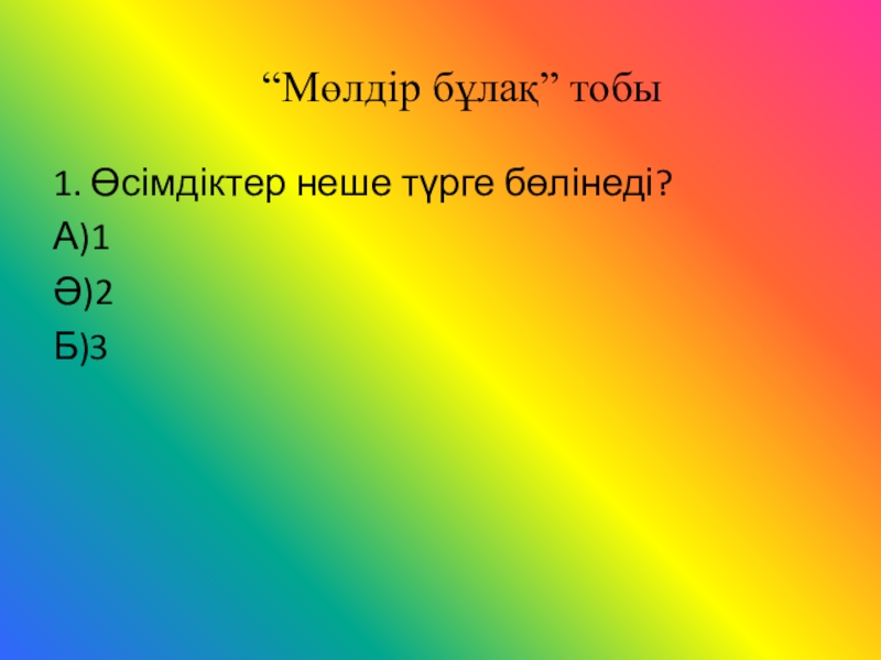 “Мөлдір бұлақ” тобы1. Өсімдіктер неше түрге бөлінеді?А)1Ә)2Б)3
