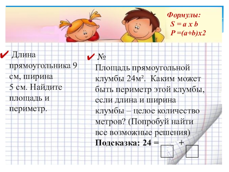 Площадь прямоугольной клумбы 24м². Каким может быть периметр этой клумбы, если длина и ширина клумбы – целое количество метров? (Попробуй найти все возможные решения) Подсказка: 24 = +