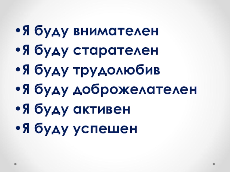 •Я буду внимателен•Я буду старателен•Я буду трудолюбив•Я буду доброжелателен•Я буду активен•Я буду успешен