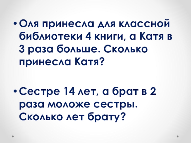 Оля принесла для классной библиотеки 4 книги, а Катя в 3 раза больше. Сколько принесла Катя?Сестре 14