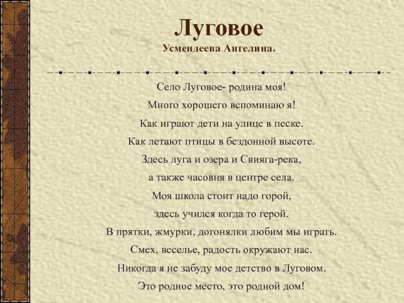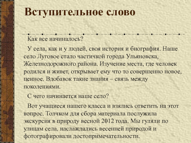 После этого возникла идея продолжить сбор материала о селе, о его людях. Каждый из ребят взял себе тему для исследования. Потрудиться пришлось не мало. Многие материалы мы собирали в своем селе, расспрашивая местных жителей, часть в школьном музее, использовали и архивные документы. Собрав материал, мы пришли к выводу, что в первую очередь Луговое начинается с добрых людей, живущих на этой земле, с любви к родному краю, с милой сердцу земле.