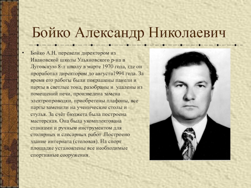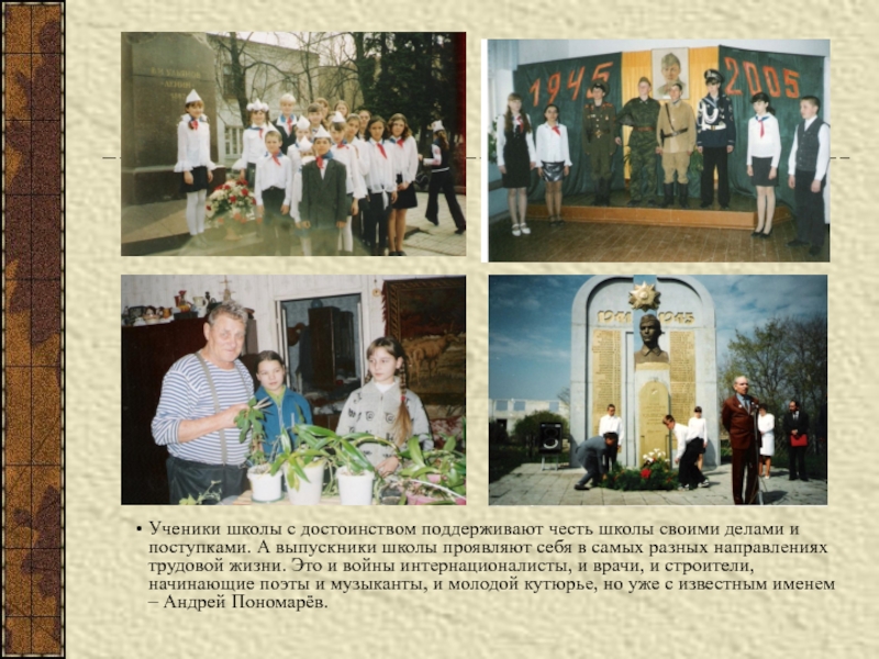 поступками. А выпускники школы проявляют себя в самых разных направлениях трудовой жизни. Это и войны интернационалисты, и врачи, и строители, начинающие поэты и музыканты, и молодой кутюрье, но уже с известным именем – Андрей Пономарёв.