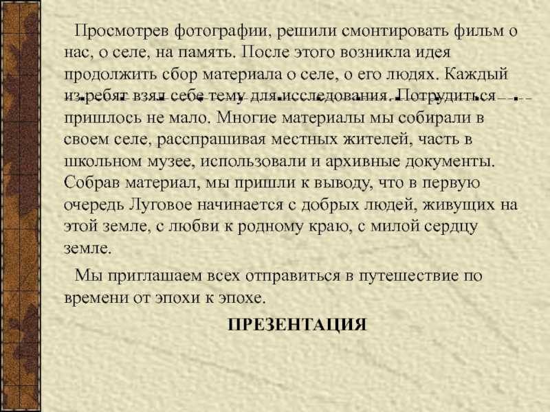 Слайд 13Просмотрев фотографии, решили смонтировать фильм о нас, о селе, на память.