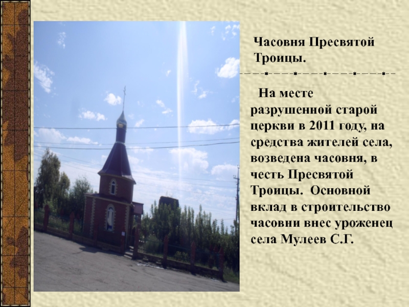 села, возведена часовня, в честь Пресвятой Троицы. Основной вклад в строительство часовни внес уроженец села Мулеев С.Г.