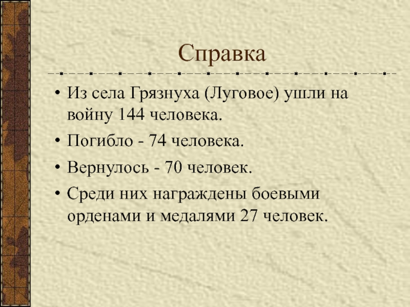 Из села Грязнуха (Луговое) ушли на войну 144 человека.