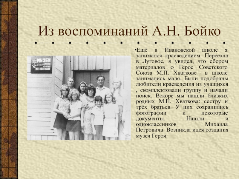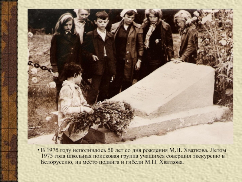 Летом 1975 года школьная поисковая группа учащихся совершил экскурсию в Белоруссию, на место подвига и гибели М.П. Хваткова.