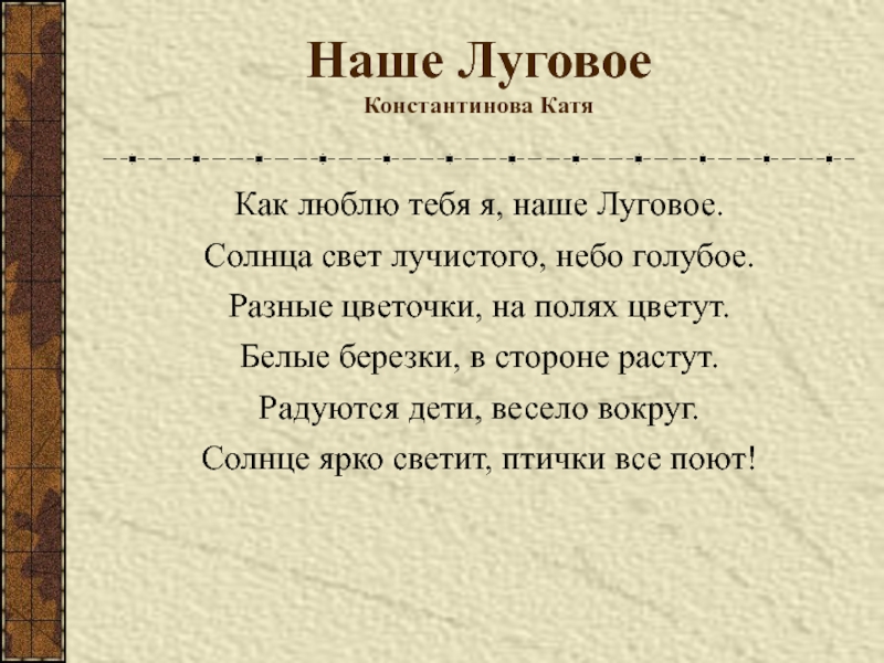 А самым главным, я считаю, что построили детские площадки. Там мы играть с друзьями собираемся после уроков. Я хочу, чтобы Луговое стало еще красивее и богаче.