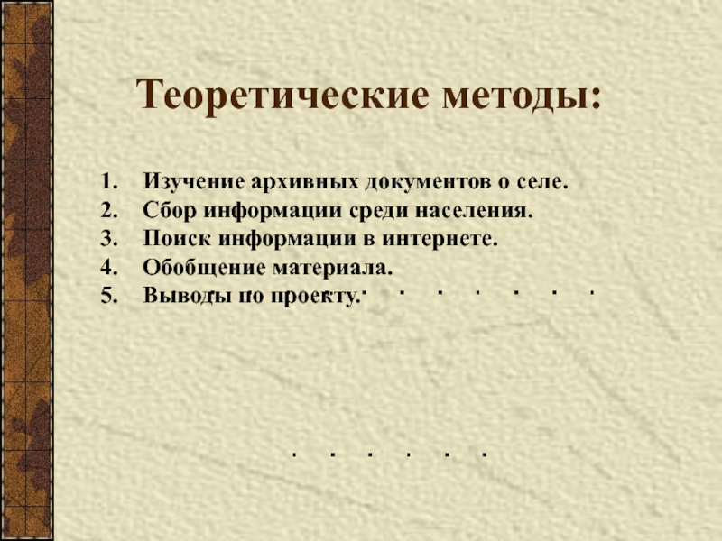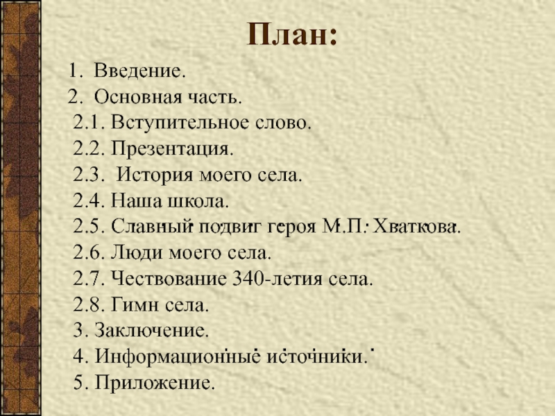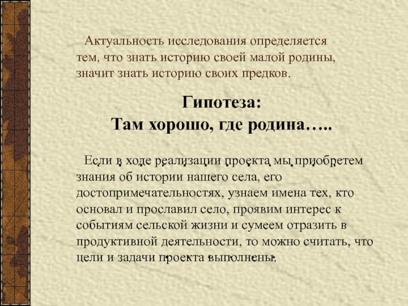Если в ходе реализации проекта мы приобретем знания об истории нашего села, его достопримечательностях, узнаем имена тех, кто основал и прославил село, проявим интерес к событиям сельской жизни и сумеем отразить в продуктивной деятельности, то можно считать, что цели и задачи проекта выполнены.