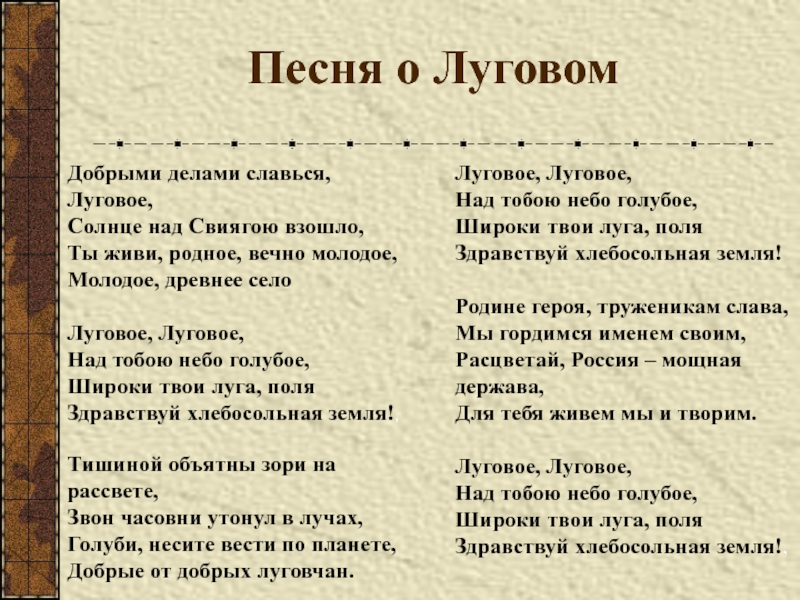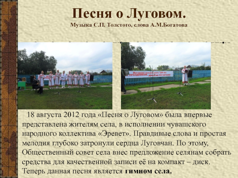 «Песня о Луговом» была впервые представлена жителям села, в исполнении чувашского народного коллектива «Эревет». Правдивые слова и простая мелодия глубоко затронули сердца Луговчан. По этому, Общественный совет села внес предложение селянам собрать средства для качественной записи её на компакт – диск. Теперь данная песня является гимном села.