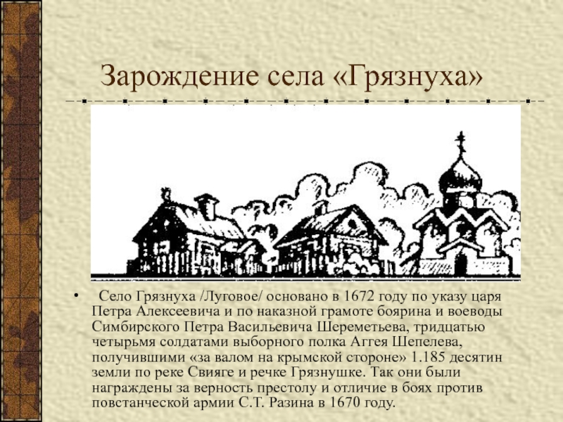 царя Петра Алексеевича и по наказной грамоте боярина и воеводы Симбирского Петра Васильевича Шереметьева, тридцатью четырьмя солдатами выборного полка Аггея Шепелева, получившими «за валом на крымской стороне» 1.185 десятин земли по реке Свияге и речке Грязнушке. Так они были награждены за верность престолу и отличие в боях против повстанческой армии С.Т. Разина в 1670 году.