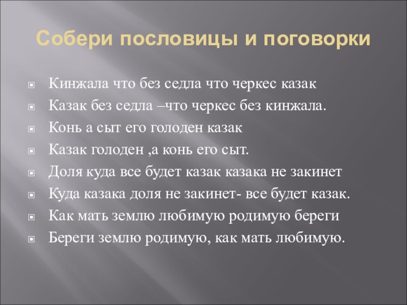 Собери пословицы и поговоркиКинжала что без седла что черкес казакКазак без седла –что черкес без кинжала.Конь а