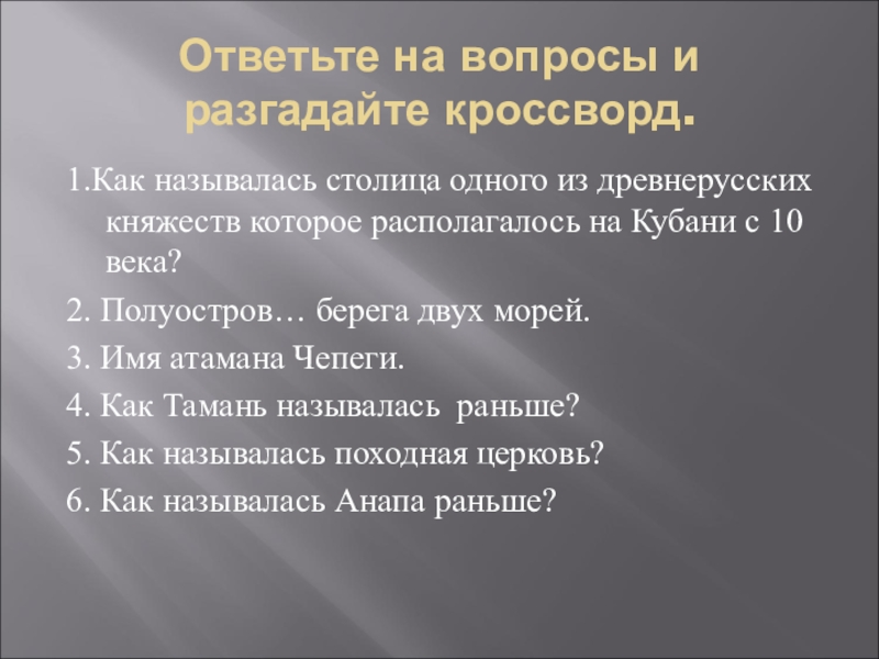 Ответьте на вопросы и разгадайте кроссворд. 1.Как называлась столица одного из древнерусских княжеств которое располагалось на Кубани