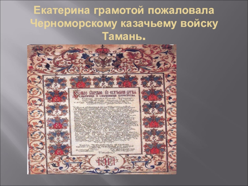 Слайд 6Екатерина грамотой пожаловала Черноморскому казачьему войску Тамань.