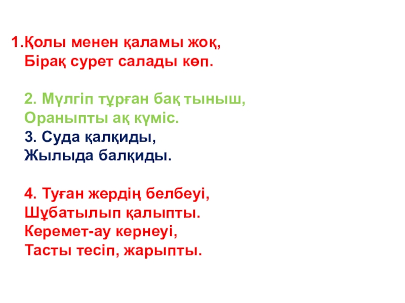 Қолы менен қаламы жоқ,Бірақ сурет салады көп. 2. Мүлгіп тұрған бақ тыныш,Ораныпты ақ күміс. 3. Суда қалқиды,Жылыда
