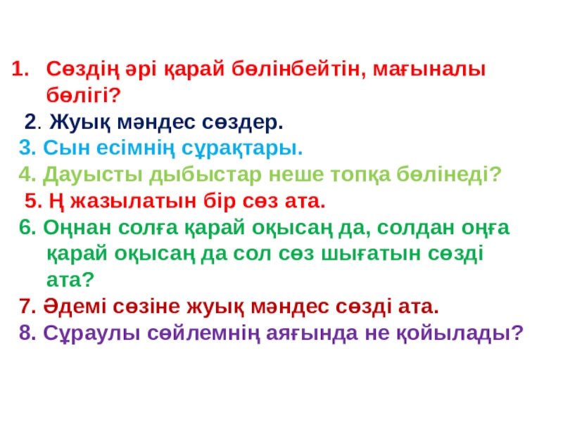 Сөздің әрі қарай бөлінбейтін, мағыналы бөлігі? 2. Жуық мәндес сөздер.3. Сын есімнің сұрақтары.4. Дауысты дыбыстар неше топқа