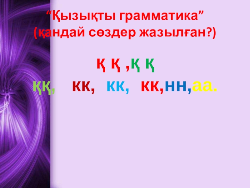 “Қызықты грамматика” (қандай сөздер жазылған?)қ қ ,қ қ ққ,  кк, кк, кк,нн,аа.