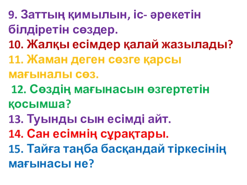 9. Заттың қимылын, іс- әрекетін білдіретін сөздер.10. Жалқы есімдер қалай жазылады?11. Жаман деген сөзге қарсы мағыналы сөз.