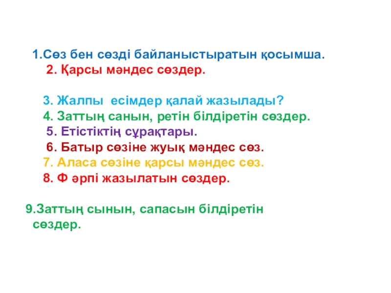 Сөз бен сөзді байланыстыратын қосымша. 2. Қарсы мәндес сөздер.3. Жалпы есімдер қалай жазылады?4. Заттың санын, ретін білдіретін