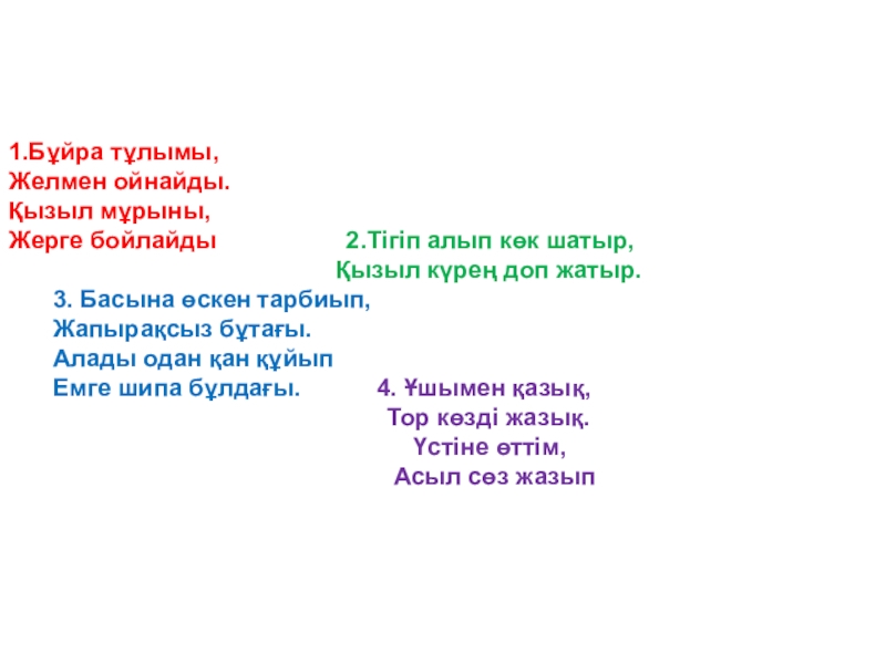 1.Бұйра тұлымы,Желмен ойнайды.Қызыл мұрыны,Жерге бойлайды          2.Тігіп алып көк