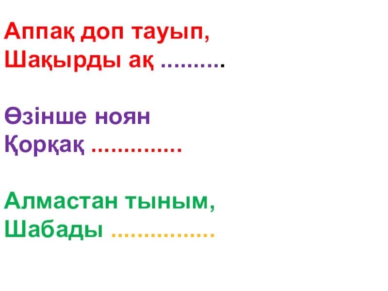 Аппақ доп тауып,Шақырды ақ ..........Өзінше ноянҚорқақ ..............Алмастан тыным,Шабады ................