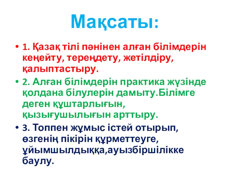 Мақсаты:1. Қазақ тілі пәнінен алған білімдерін кеңейту, тереңдету, жетілдіру, қалыптастыру.2. Алған білімдерін практика жүзінде қолдана білулерін дамыту.Білімге