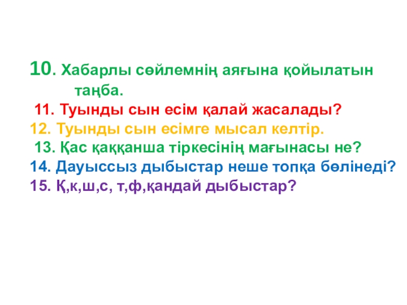 10. Хабарлы сөйлемнің аяғына қойылатын таңба. 11. Туынды сын есім қалай жасалады? 12. Туынды сын есімге мысал