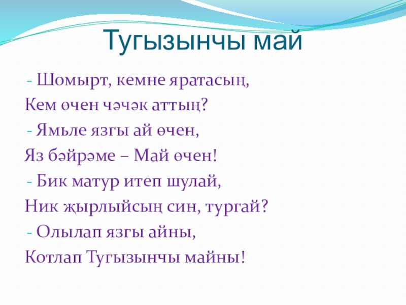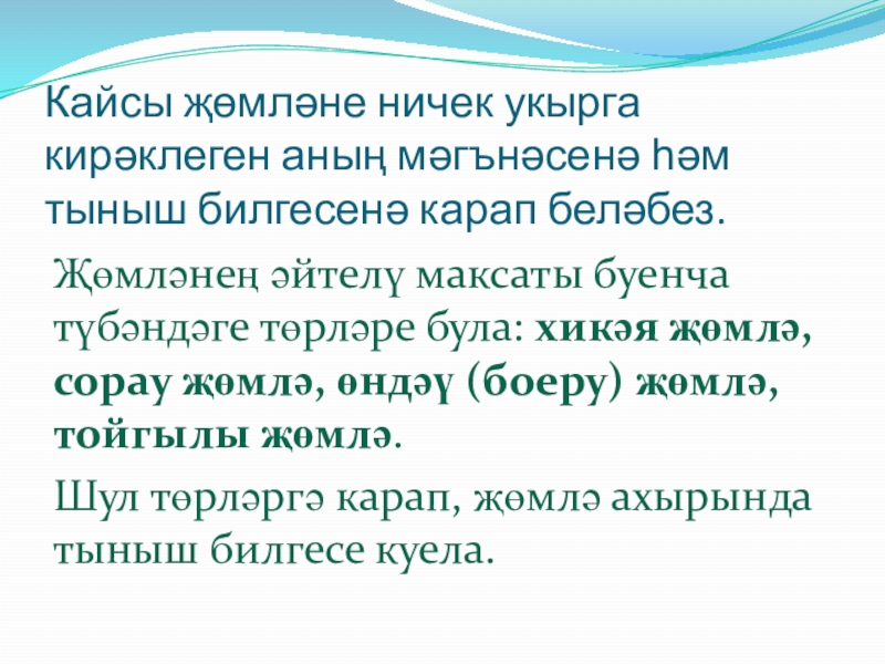 Җөмләнең әйтелү максаты буенча түбәндәге төрләре була: хикәя җөмлә, сорау җөмлә, өндәү (боеру) җөмлә, тойгылы җөмлә.